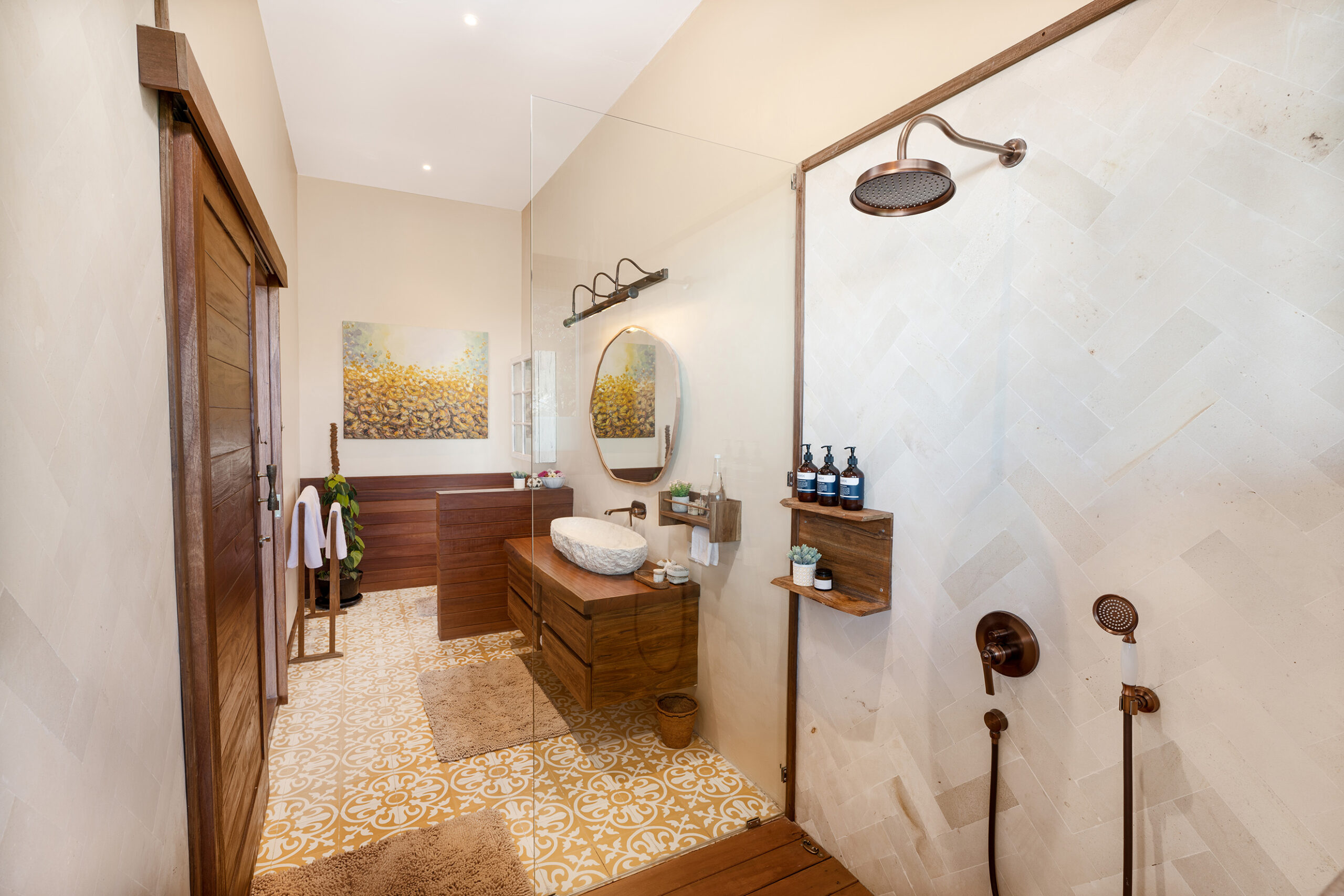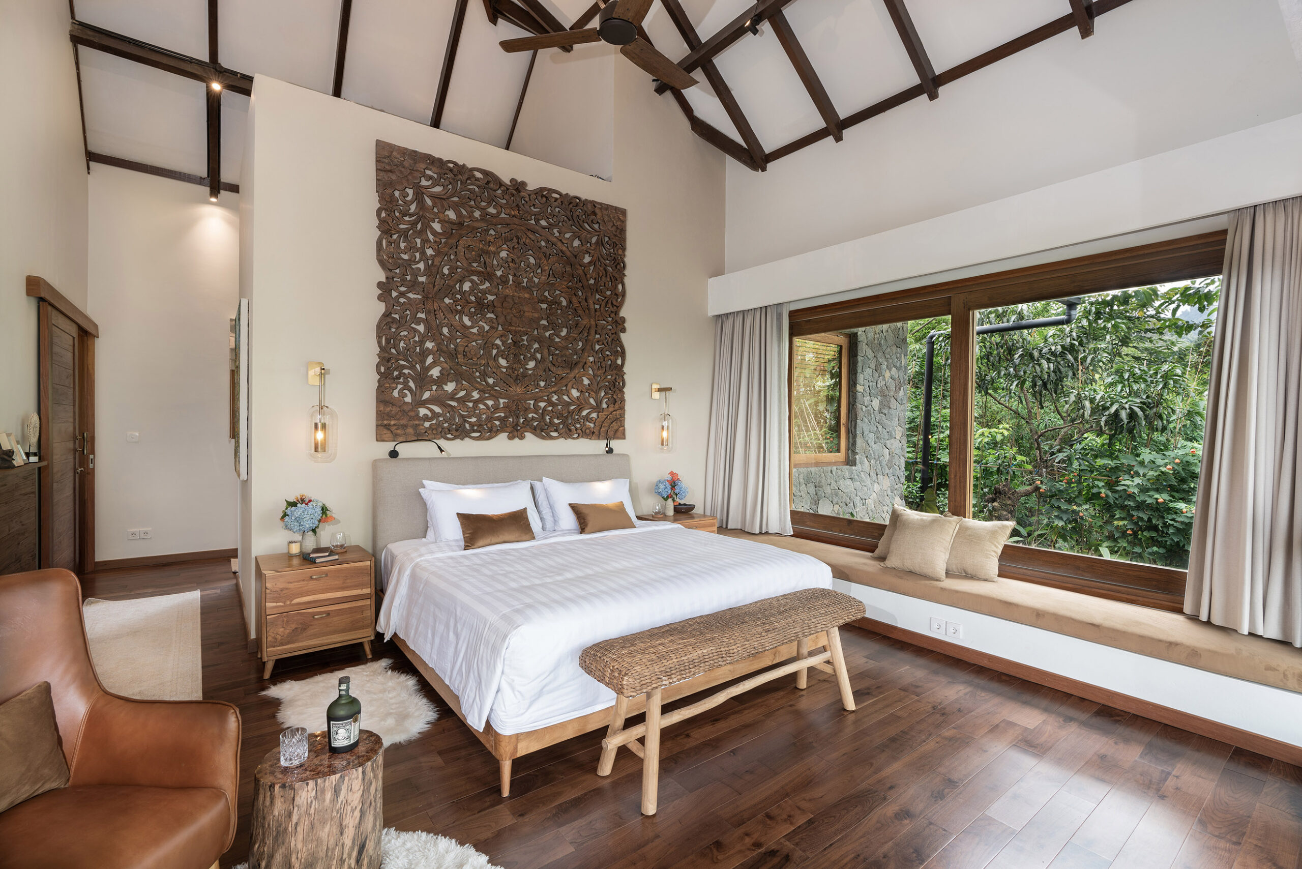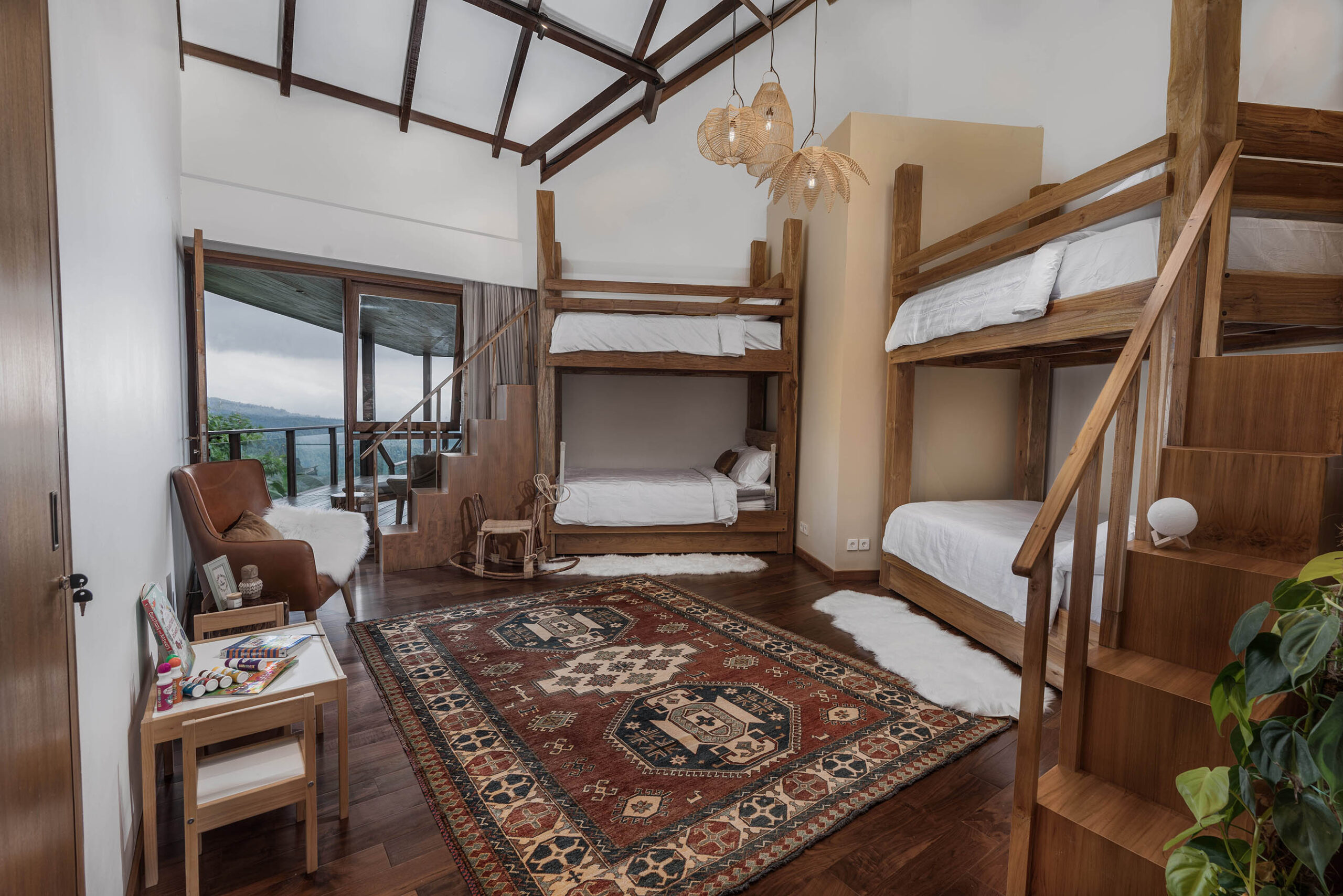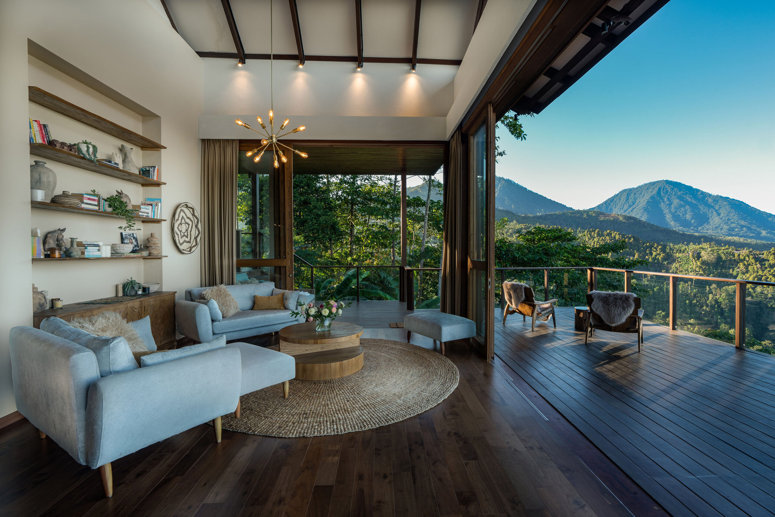 The villa features 350m² of interior living space and 150m² of outdoor decking, blending modern European design with elegant Balinese touches. Every bedroom and living area is positioned to maximize the breathtaking valley and mountain views.